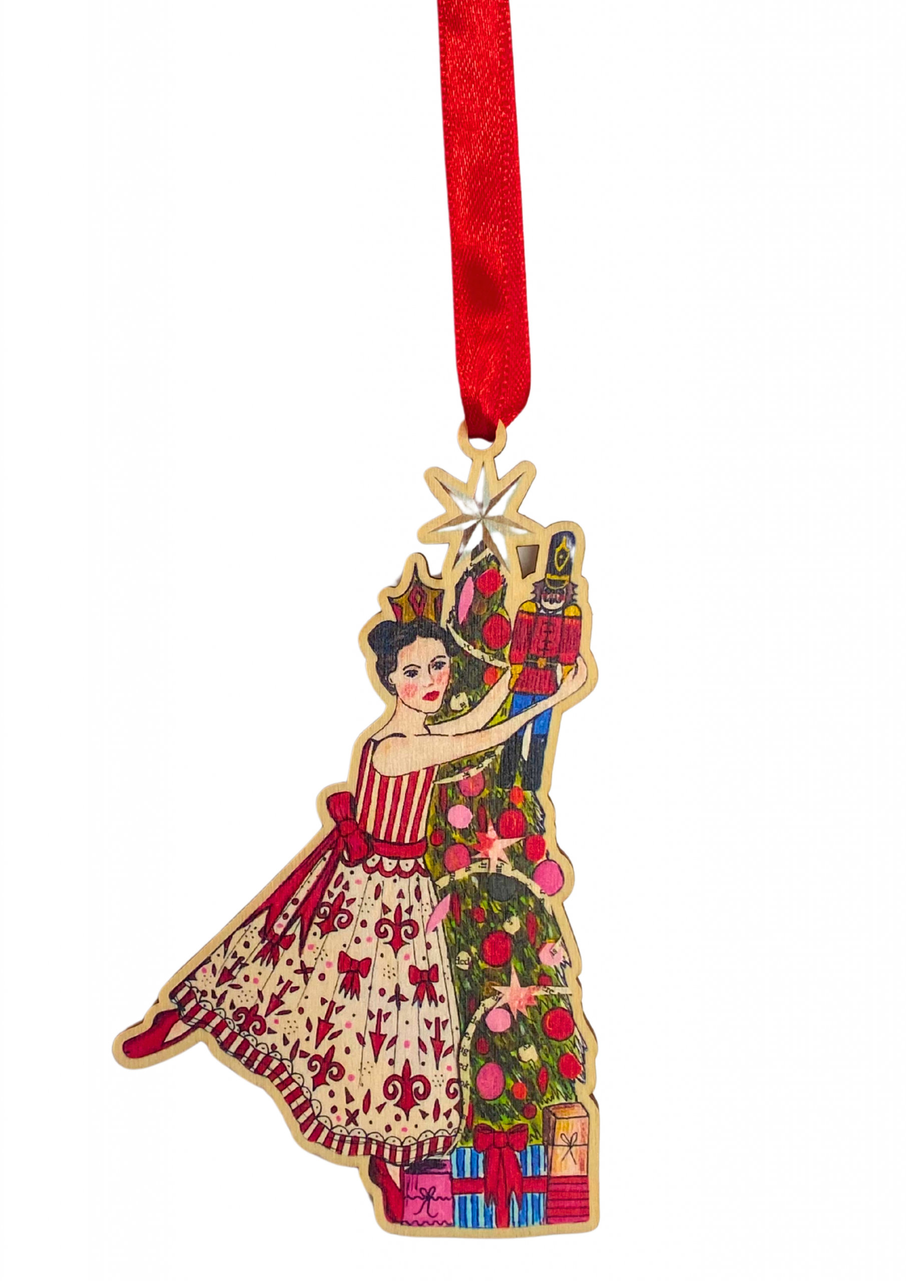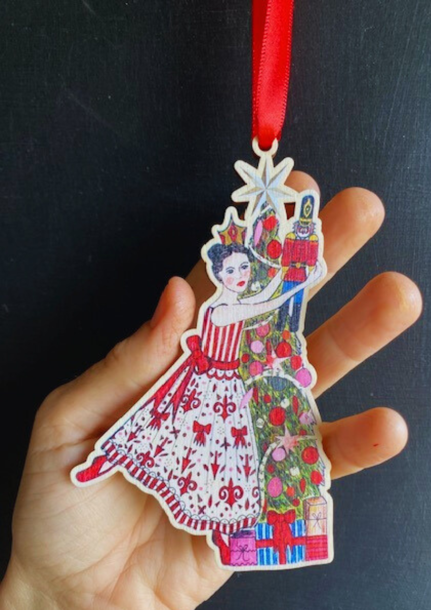 Clara’s Nutcracker is a hanging decoration which has been printed onto sustainably forested wood from an original drawing, with a red ribbon.