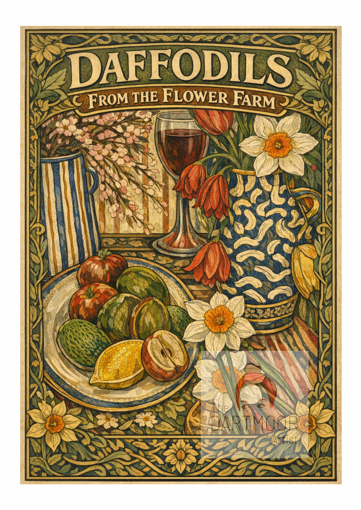 Whenever the daffs arrive here on the farm they suddenly pop – there is no slow growth, or at least I’m not aware of seeing it. They just seem to suddenly arrive and they’re always such a joy to see. This print celebrates the arrival of daffodils…and my other loves…a nice glass of vino and picky food!