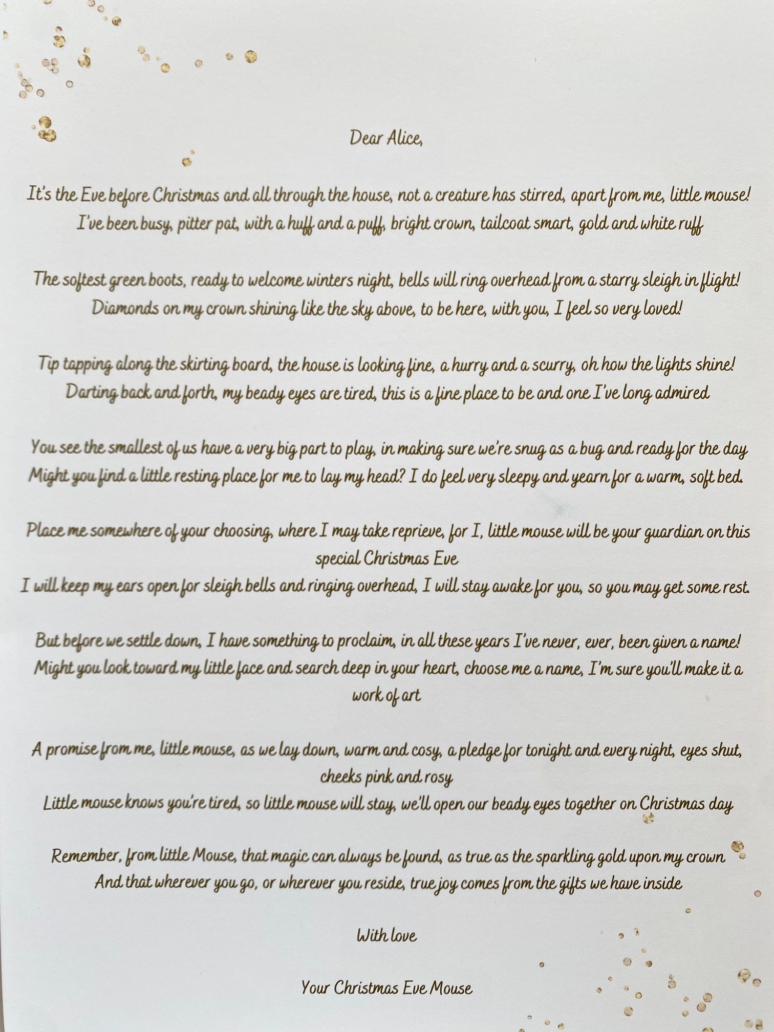 But before we settle down, I have something to proclaim, in all these years I’ve never, ever, been given a name! Might you look toward my little face and search deep in your heart, choose me a name, I’m sure you’ll make it a work of art. A promise from me, little mouse, as we lay down, warm and cosy, a pledge for tonight and every night, eyes shut, cheeks pink and rosy. Little mouse knows you’re tired, so little mouse will stay, we’ll open our beady eyes together on Christmas day. Remember, from little Mouse, that magic can always be found, as true as the sparkling gold upon my crown. And that wherever you go, or wherever you reside, true joy comes from the gifts we have inside. With love, Your Christmas Eve Mouse